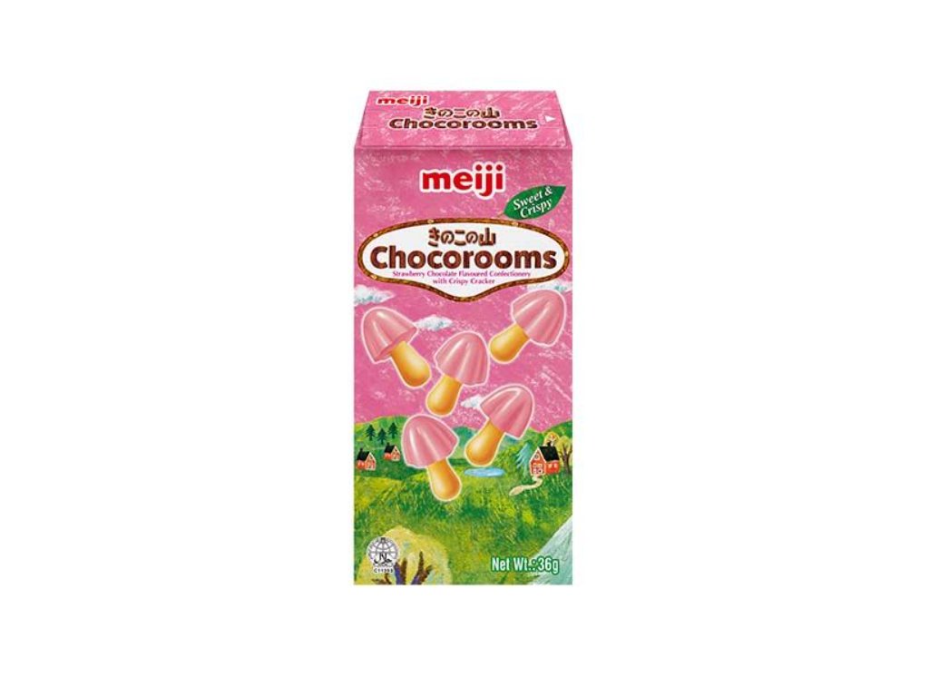Jahodovo-čokoládové sušenky Chocorooms od značky Meiji jsou oblíbenou sladkostí ve tvaru malých houbiček. Křupavý sušenkový základ doplňuje jemná čokoláda s příjemnou jahodovou příchutí. Skvěle se hodí jako sladká svačina, ke kávě, čaji nebo jen tak na mlsání během dne.