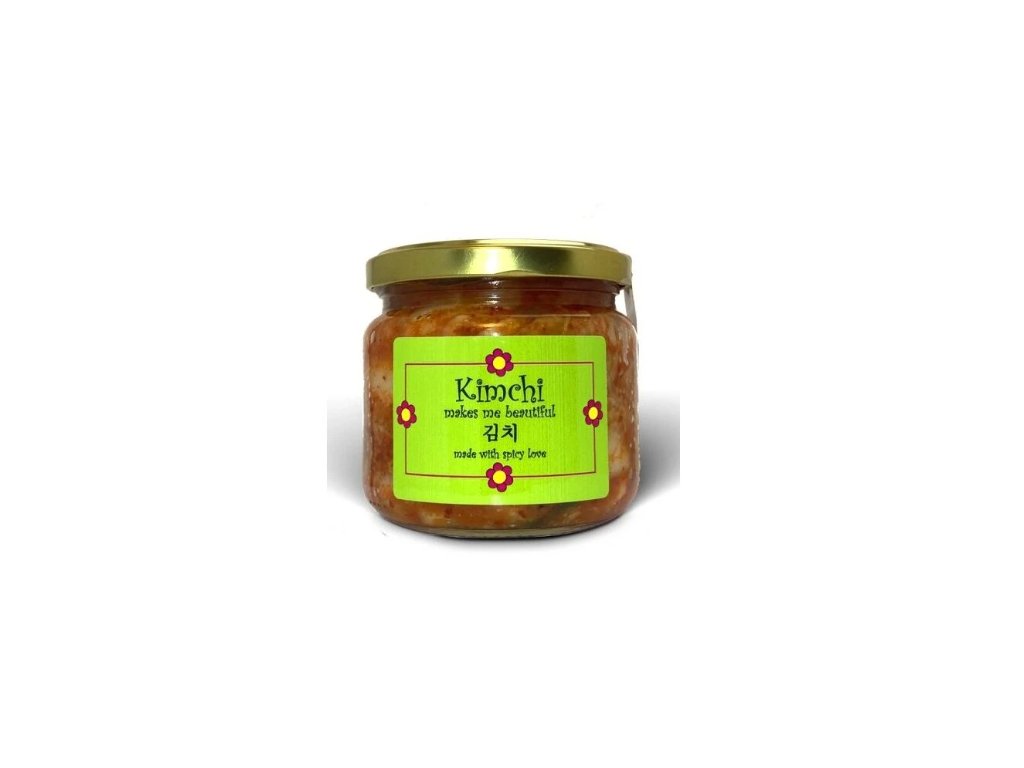 Složení: čínské zelí 80%, cibule, gochugaru (Korean chilli paprika), zázvor, česnek, jarní cibulka, cukr, mořská sůl, jablka, pitná voda, rýžová mouka, rybí omáčka (40% sardelový extrakt, voda, sůl, cukr). Alergeny: zázvor, ryby. Bez konzervantů. Uchovávejte v chladném a suchém místě. Skladujte při teplotě 6 - 10°C .