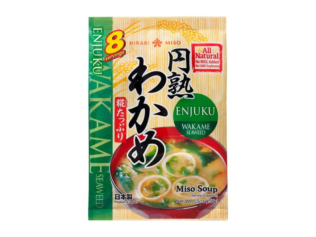 Složení: miso pasta: sójová pasta 68% (voda, rýže, sója, sůl), voda, alkohol, cukr, výtažek z řas, sůl. Obloha: mořské řasy 6%, pečený lepek (pšeničná mouka – pšeničný lepek, kypřící látka E500, regulátor kyselosti E330), jarní cibulka, sušený plátek bonito, sůl. Příprava: vložte obsah sáčku do misky a zalejte 160ml horké vody a míchejte dokud se miso pasta úplně nerozpustí. Alergeny: sója, pšenice.