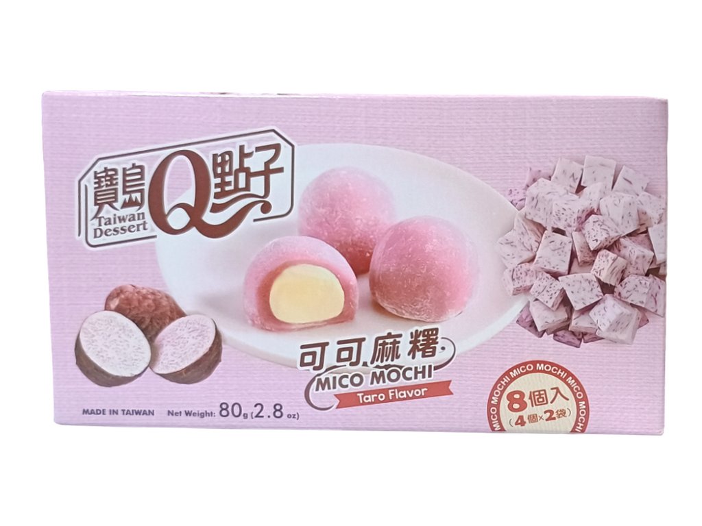 Mochi Q plněné kakaovým máslem s příchutí taro je lahodný dezert, který spojuje tradiční japonský dezert mochi s moderní příchutí taro a kakaového másla. Taro má sladkou a mírně oříškovou chuť, doplněnou jemným čokoládovým tónem.